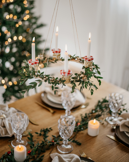 Die 4 Kerzenhalter am Holzreifen befestigen. Hierfür die Unterseite de Konfitürenglases mit Neoprenkleber bekleben. Es an die gewünschte Stelle platzieren und dann wieder entfernen. Es sollte sowohl Kleber am Holzreifen als auch am Glas sein. Warte 10 Minuten, bevor der Kerzenhalter neu positioniert wird. Einige Stunden trocknen lassen.