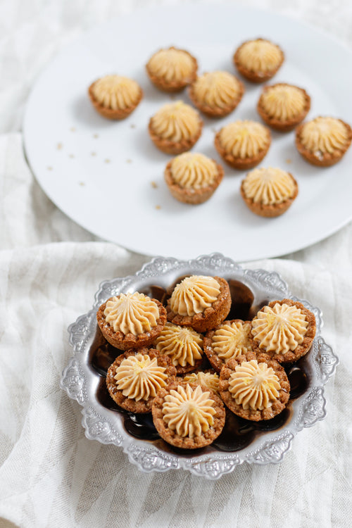 - Derweil den Ofen auf 150°C Heißluft vorheizen. Die Törtchen für 18-20 Minuten goldbraun backen. Die Törtchen noch warm mit einem kleinen Messer behutsam aus den Mulden lösen und auf einem Kuchengitter/Teller komplett auskühlen lasen.