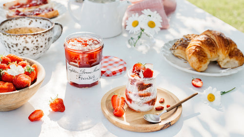 - Am nächsten Tag bereiten Sie das Dessert zu, indem Sie abwechselnd eine Schicht Chia-Pudding, eine Schicht griechischen Joghurt und eine Schicht Bonne Maman Erdbeer-Konfitüre verwenden.