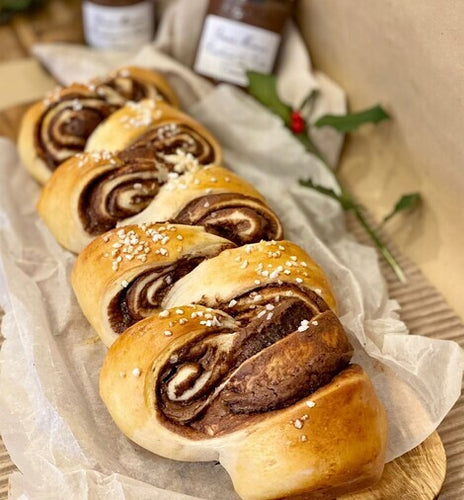 - Den Teig auf einer bemehlten Arbeitsfläsche zu einem Rechteck ausrollen und gleichmäßig mit Bonne Maman Haselnuss-Kakao Creme bestreichen.