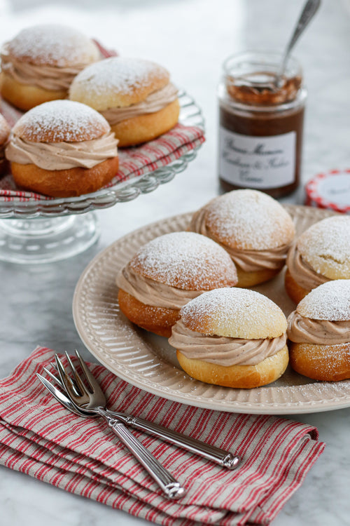 Mit etwas zerlassener Butter bestreichen. Im heißen Ofen 13-14 Minuten backen. Abkühlen lassen. Von den Ofenkrapfen jeweils einen kleinen Deckel abschneiden. - Für die Creme 250 ml Milch aufkochen. 50 ml Milch mit dem Puddingpulver verrühren und in die heiße Milch einrühren, bis ein schöner cremiger Pudding entsteht. Gelatineblätter in kaltem Wasser einweichen, ausdrücken und im heißen Pudding auflösen. Gut verrühren. Pudding in eine Schüssel umfüllen, Haselnuss & Kakao Creme unter den Pudding rühren. Den Pudding direkt mit einer Folie gut abdecken und kühl stellen, bis dieser fest geworden und komplett kalt ist. Schlagobers cremig steif schlagen und behutsam unter den Pudding heben. Die Creme in einen Spritzbeutel mit großer Sterntülle füllen und auf die Krapfen spritzen. Den Deckel aufsetzen und mit Staubzucker besieben. Bis zum Servieren kühl stellen.