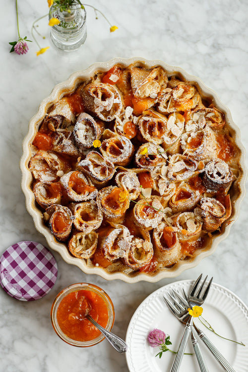 Überbackene Topfen-Palatschinken mit Marillen-Konfitüre